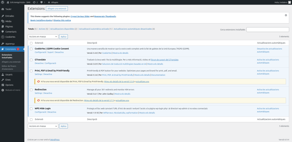 Aquests són els plugins que he implementat en el meu WordPress. Serveixen per millorar la seguretat, redirigir enllaços, descarregar p+agines a pdf i per la política de cookies.