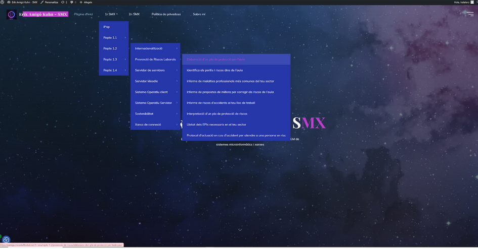 Per organitzar el menú del meu WordPress i tenir-lo endreçat, he creat un conjunt de pàgines i les he utilitzat de pàgines mare per afegir pàgines dins d’altres pàgines. Es a dir, tinc creada la pàgina “1r SMX”, dins d’aquesta pàgina, he afegit les pàgines “Repte 1.1, “Repte 1.2″… I dins dàquestes pàgines he afegit les pàgines dels encàrrecs i dins dels encàrrecs ja hi son les tasques.