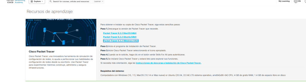Aneu a https://www.netacad.com/es/articles/news/download-cisco-packet-tracer?courseLang=es-XL i descarregueu la versió adequada per al vostre sistema operatiu de Packet Tracer.