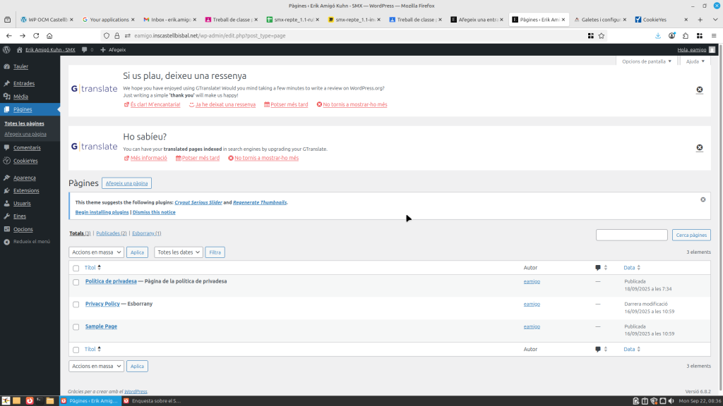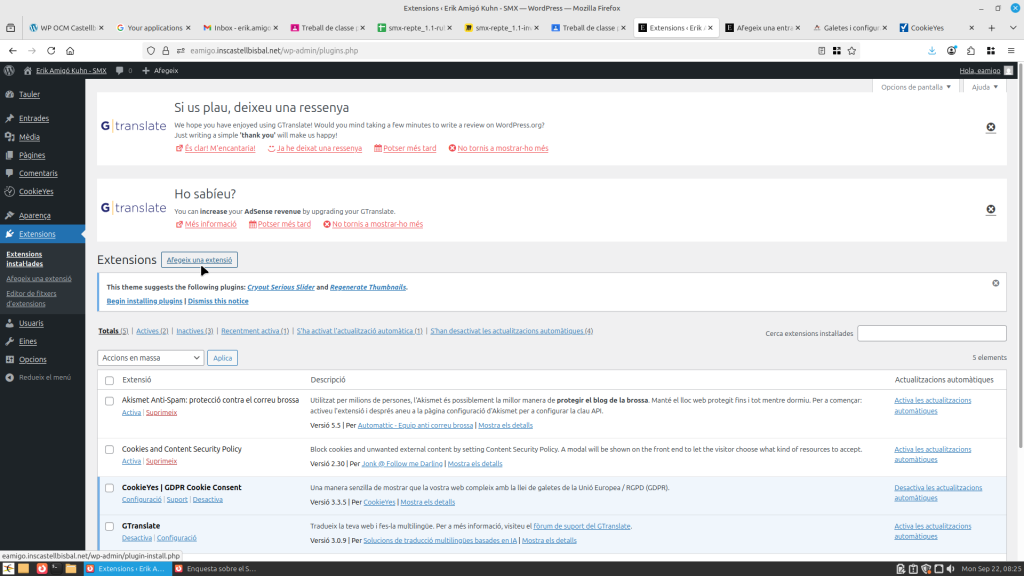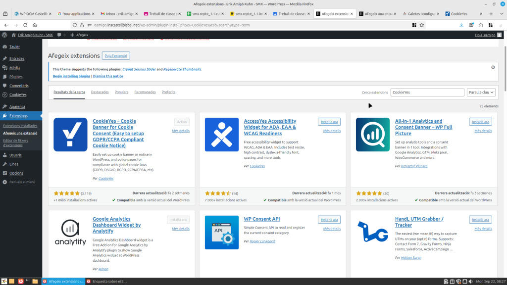 Cerquem la extensió que més ens agradi, en el meu cas he utilitzat CookieYes, i cliquem en “Instal·la ara” i després cliquem en “Activar”