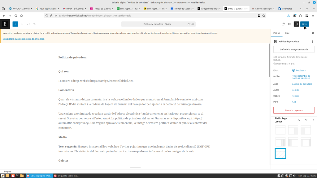 Ens dirigim a l’apartat “Pàgines” i cliquem al document “Política de privadesa”.