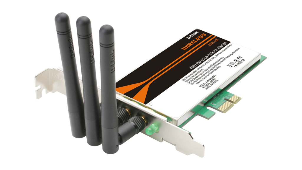 La D-Link DWA-556 és una targeta PCI Express que permet donar connexió WiFi a un ordinador. Funciona amb l’estàndard 802.11n (fins a 300 Mbps) i també és compatible amb xarxes 802.11g i 802.11b. Utilitza tres antenes externes per millorar el senyal i és compatible amb WEP, WPA i WPA2. S’instal·la en una ranura PCIe x1 i serveix per connectar l’equip a xarxes sense fils de 2,4 GHz.