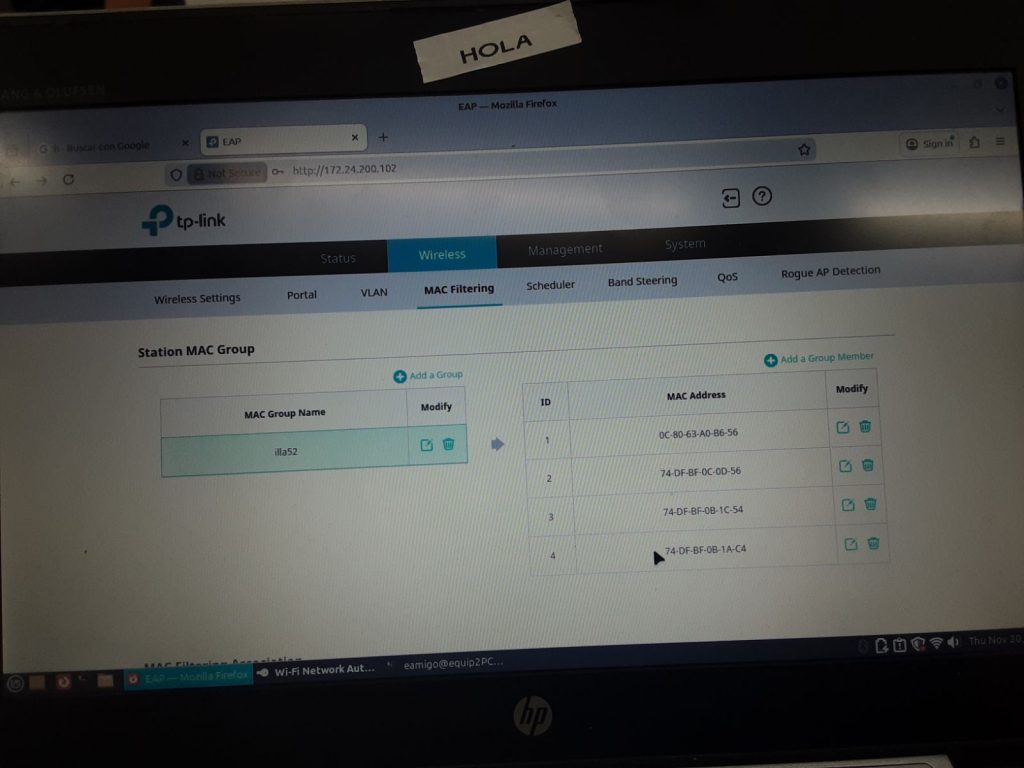 He filtrat la MAC de l’AP afegint les MACs de tots els dispositius que tindran connexió a la nostra xarxa wireless.